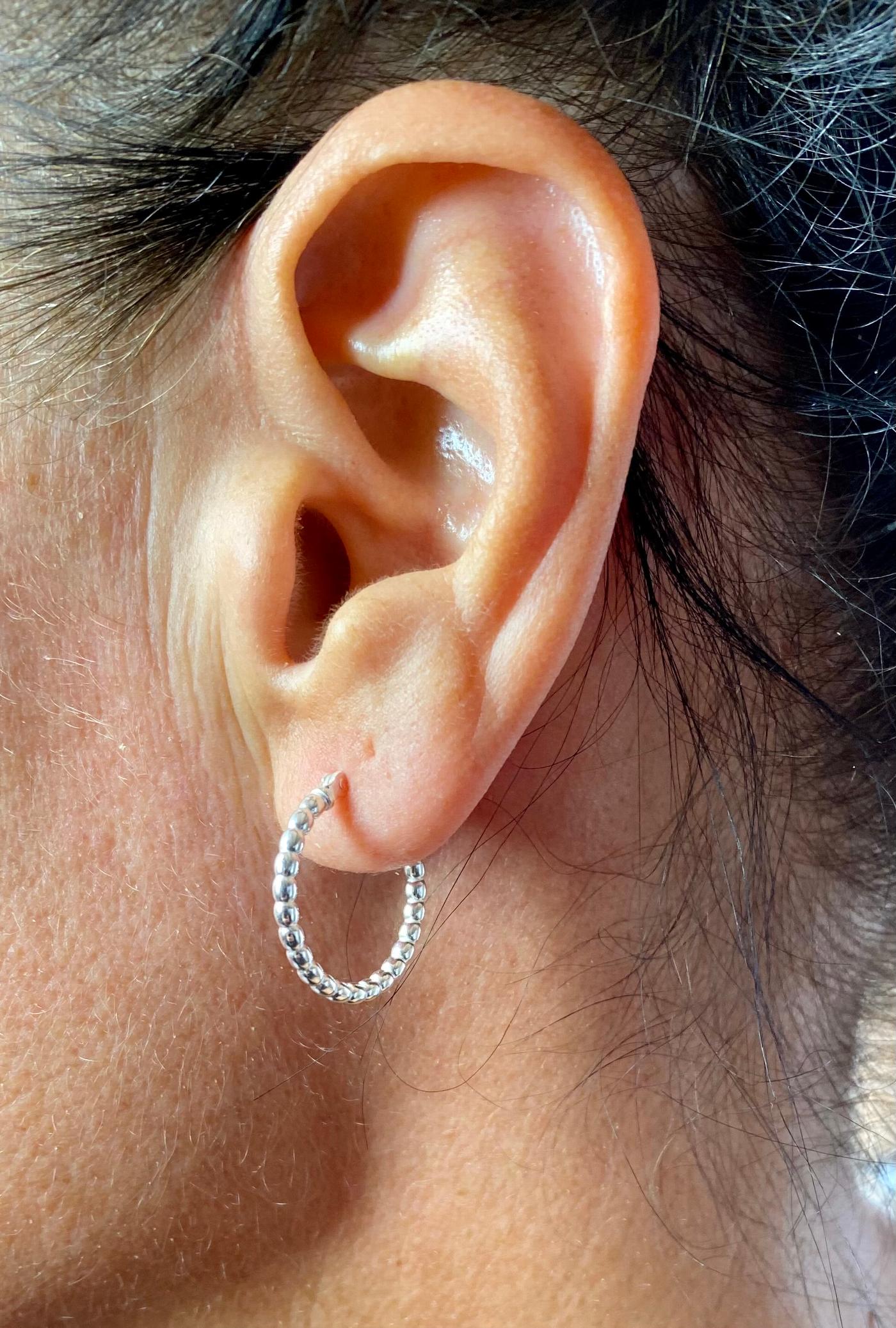 Lightweight and stylish, these 20mm beaded hinged hoops are perfect for everyday wear. Effortlessly chic with a secure snap closure, they add a suble sparkle to any look.