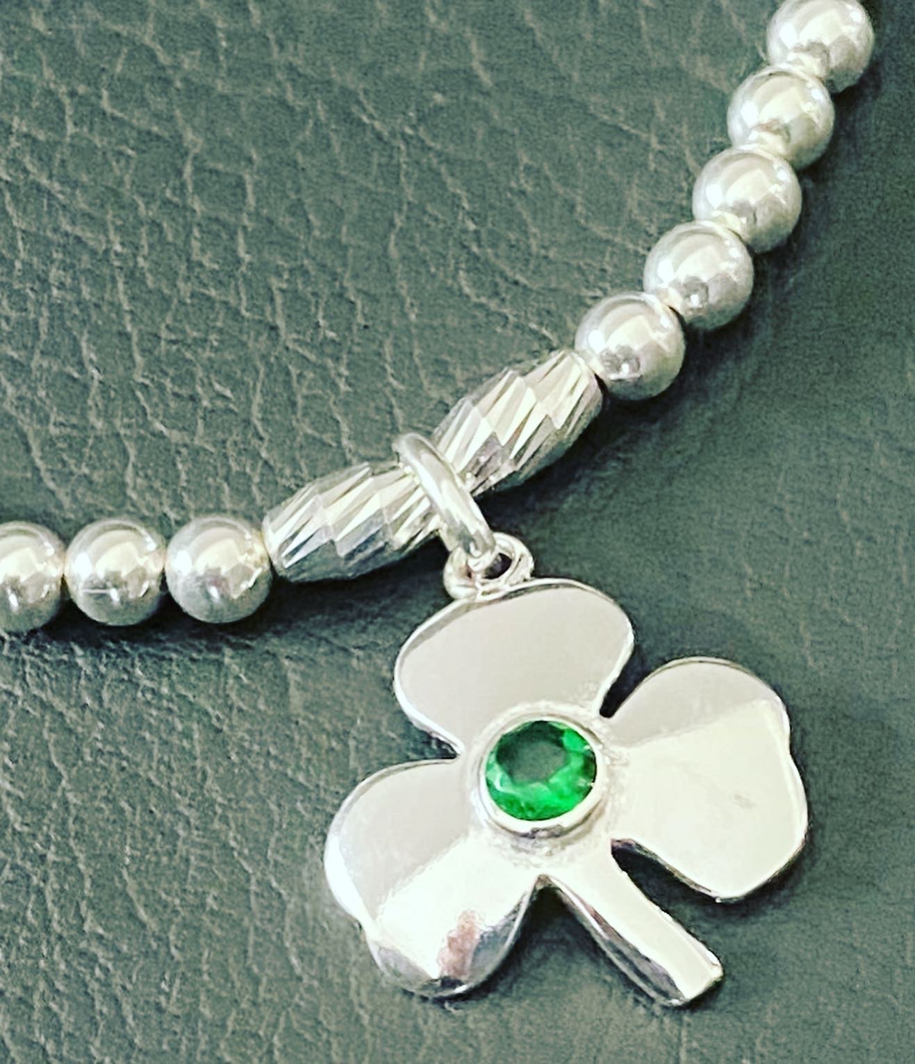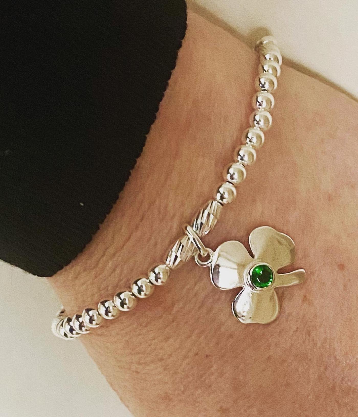 How beautiful is this Shamrock with a piercing green C/Z. This Beaded bracelet is made with 4mm round and Bar cut sterling silver beads. Size S - 16cm M - 18cm L - 19.5cm